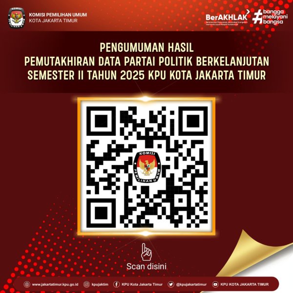 Informasi lengkap mengenai hasil pemutakhiran data dan dokumen persyaratan partai politik dapat diakses melalui tautan resmi atau dengan memindai QR Code yang tersedia dalam pengumuman atau anda dapat mengunduhnya di sini: