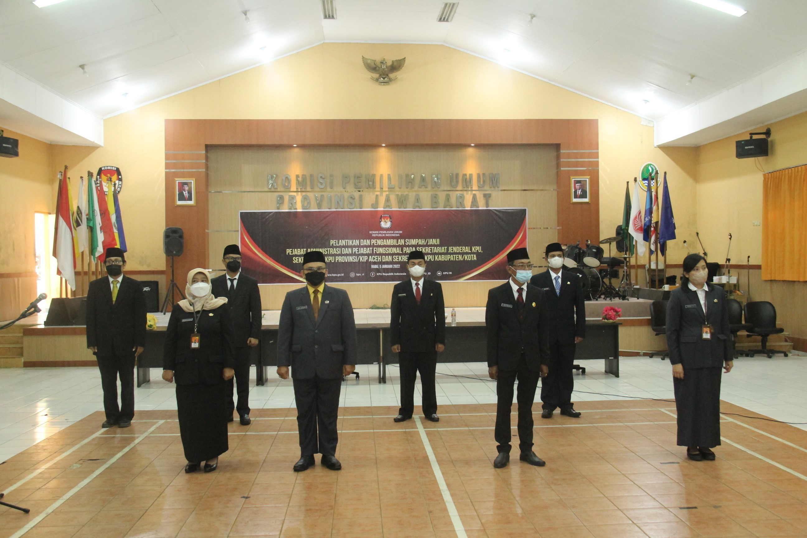 Pelantikan serentak tersebut digelar secara daring, pelantikan dan pengambilan sumpah/ janji itu digelar di Aula Setia Permana, Kantor Sekretariat KPU Provinsi Jawa Barat di Jl Garut , Kota Bandung pada hari Selasa, (5/1/2022). Dalam arahannya, Sekjen KPU RI, Bernad Dermawan Sutrisno mengatakan, pelantikan tersebut merupakan bagian dari implementasi PKPU 14 tahun 2020 tentang Tugas, Fungsi, Susunan Organisasi dan Tata Kerja (SOTK), terutama di tingkat sekretariat KPU Provinsi dan Kabupaten/Kota.