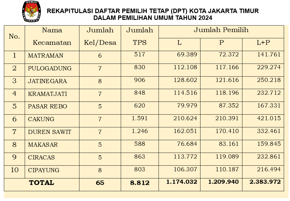 Di penghujung acara Rapat Pleno, Wage Wardana menetapkan Hasil Rekapitulasi dan Penetapan DPT tingkat Kota Jakarta Timur Pemilihan Umum Tahun 2024 dengan jumlah TPS sebanyak 8.812. Untuk pemilih Laki-Laki 1.174.032 pemilih dan untuk pemilih Perempuan sebanyak 1.209.940. Dan total pemilih Laki-Laki & Perempuan sebanyak 2.383.972 pemilih - Ar